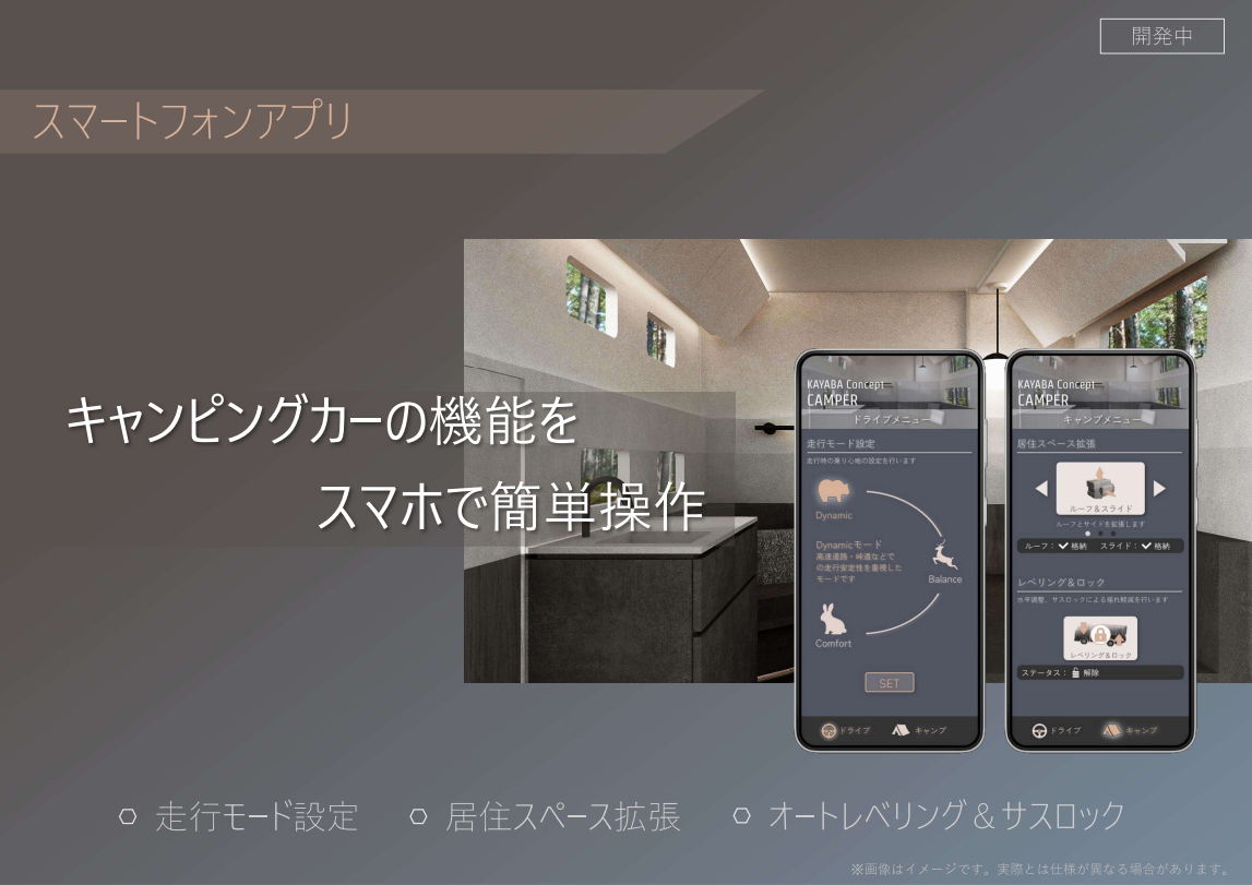 カヤバのキャンピングカーは空間(車体)拡張機能に加え、電子制御式セミアクティブダンパ、車高調整用ダンパ等の油圧技術を搭載。キャンピングカーの課題である走行・停車時の安定性や快適性を改善。