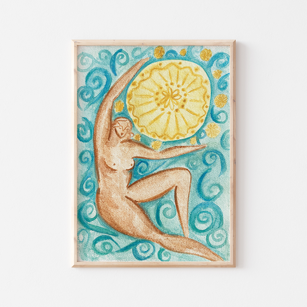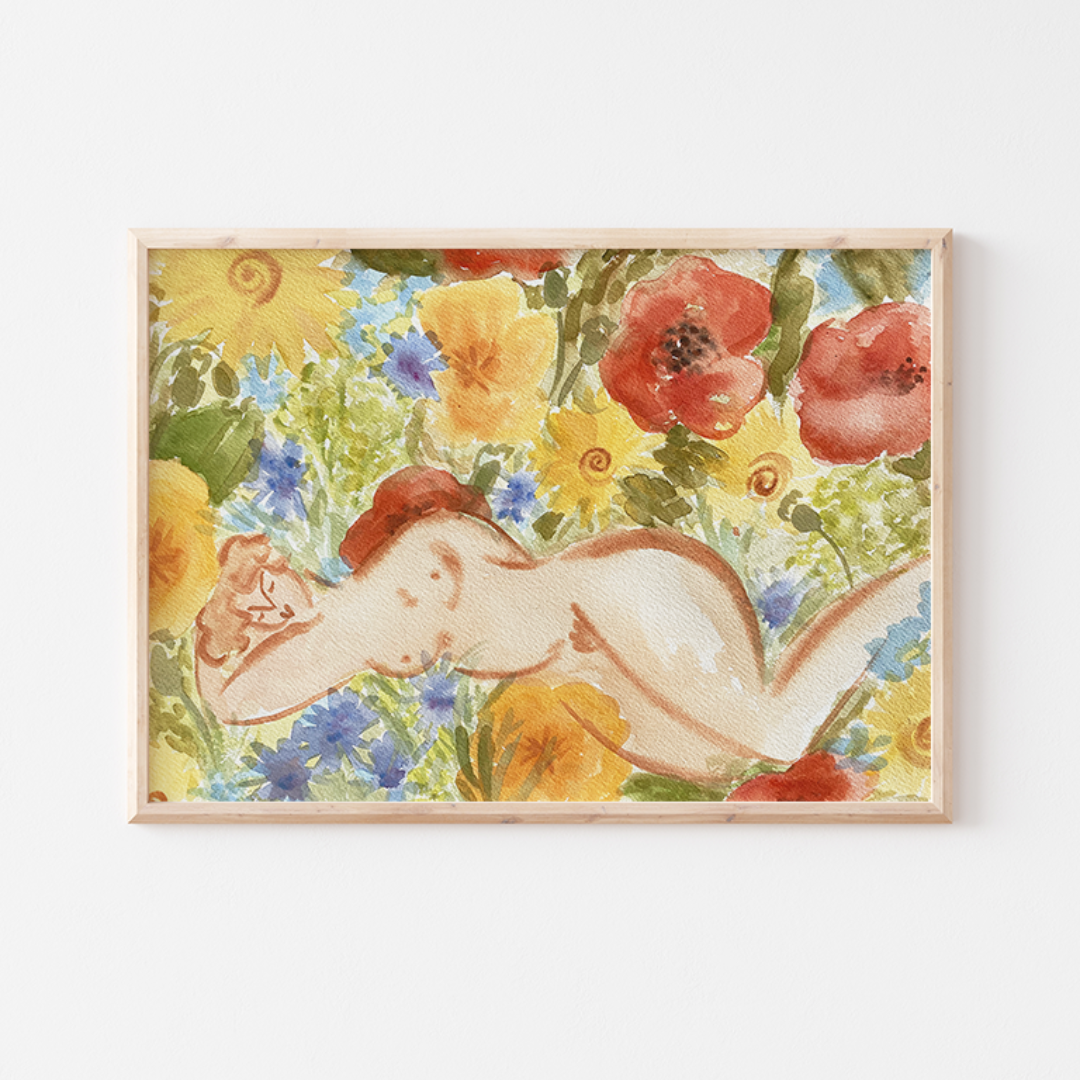 作品について:夏を感じる代名詞でもある、ポピー、矢車草、カレンデュラたちのパレード。昔使っていた水彩パレットを見つけたことがきっかけとなり、柔らかくドリーミーな色彩の野花のベッドに横たわるヌードの女性が生まれました。またイギリス・ルイスにある「Southover Grange Gardens」という地元のガーデンからもインスピレーションを得ています。