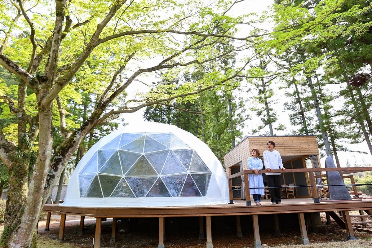 木々に囲まれたプライベート空間に5つの広々としたドーム型テントを設置。シャワー&トイレ併設で冷暖房