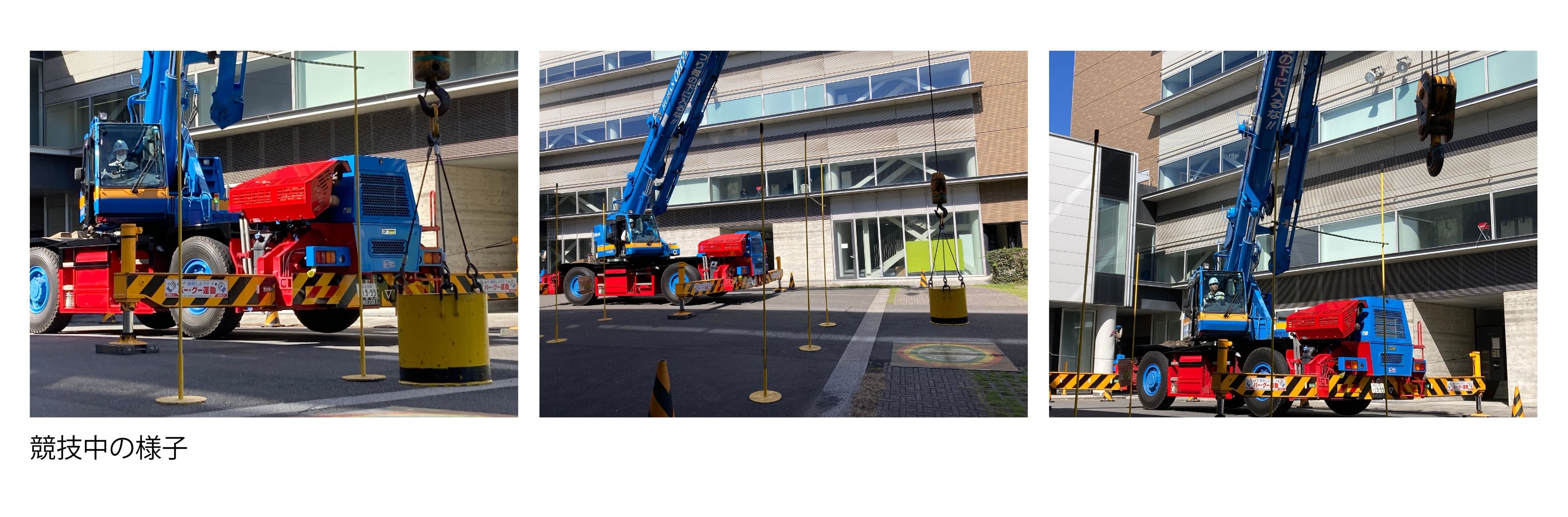 この競技は、タダノ製25tクレーンで500キログラムの吊り荷を吊り上げ、障害物の接触を避けながら総運行距離約38.8メートルのコースを一周します。タイムだけなく、吊り荷の高さ2mでの目測、同時に3つのレバー操作をしてはいけないなどのルールが設けられています。
