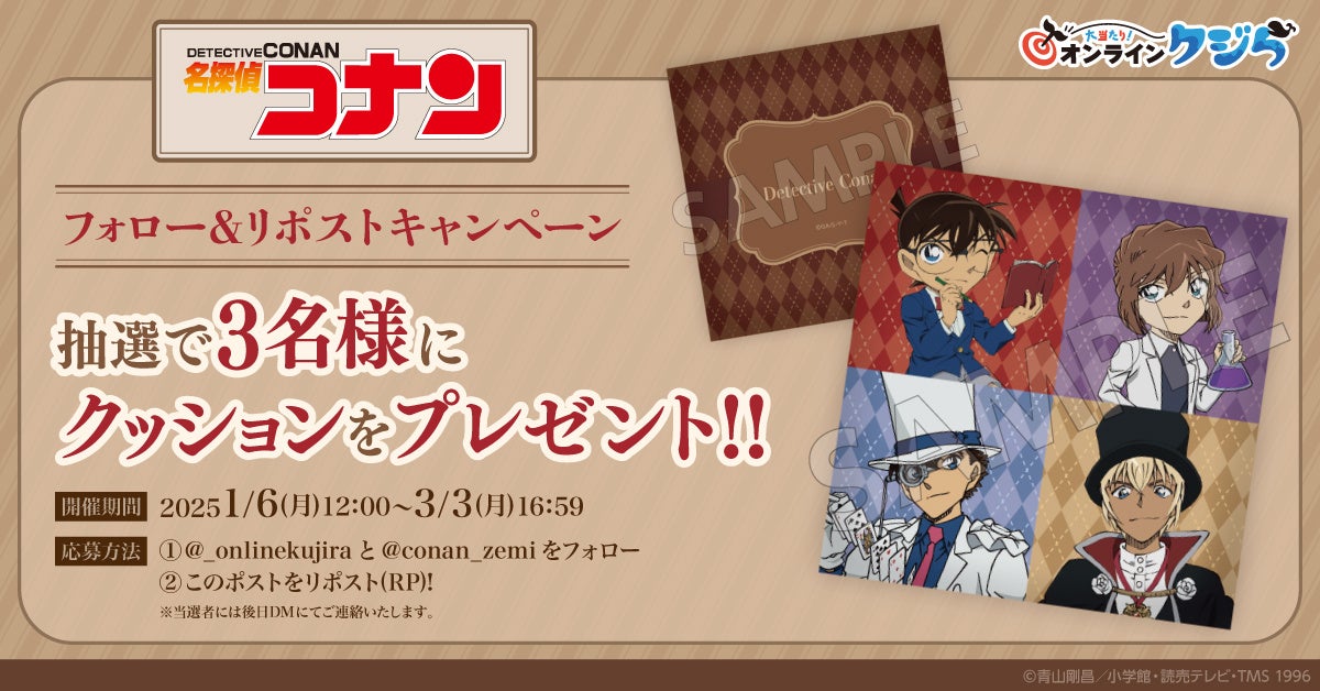 X(旧Twitter)オンラインクジらと名探偵コナンゼミ公式アカウントをフォロー&対象の投稿をリポストすると、抽選で3名様にクッションが当たります。