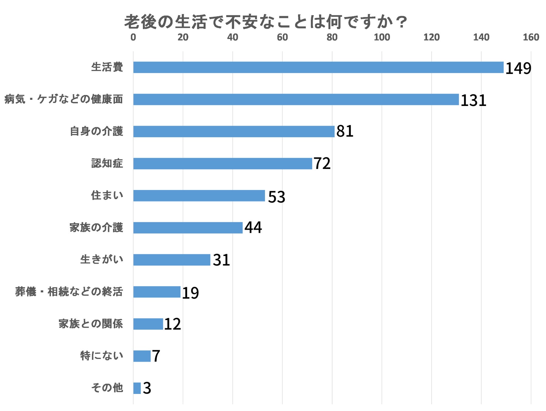 「老後の生活で不安なことは何ですか?」という質問では、「生活費」が149票を集め、131票の「病気・ケガなどの健康面」、81票の「自身の介護」が続く結果になりました。