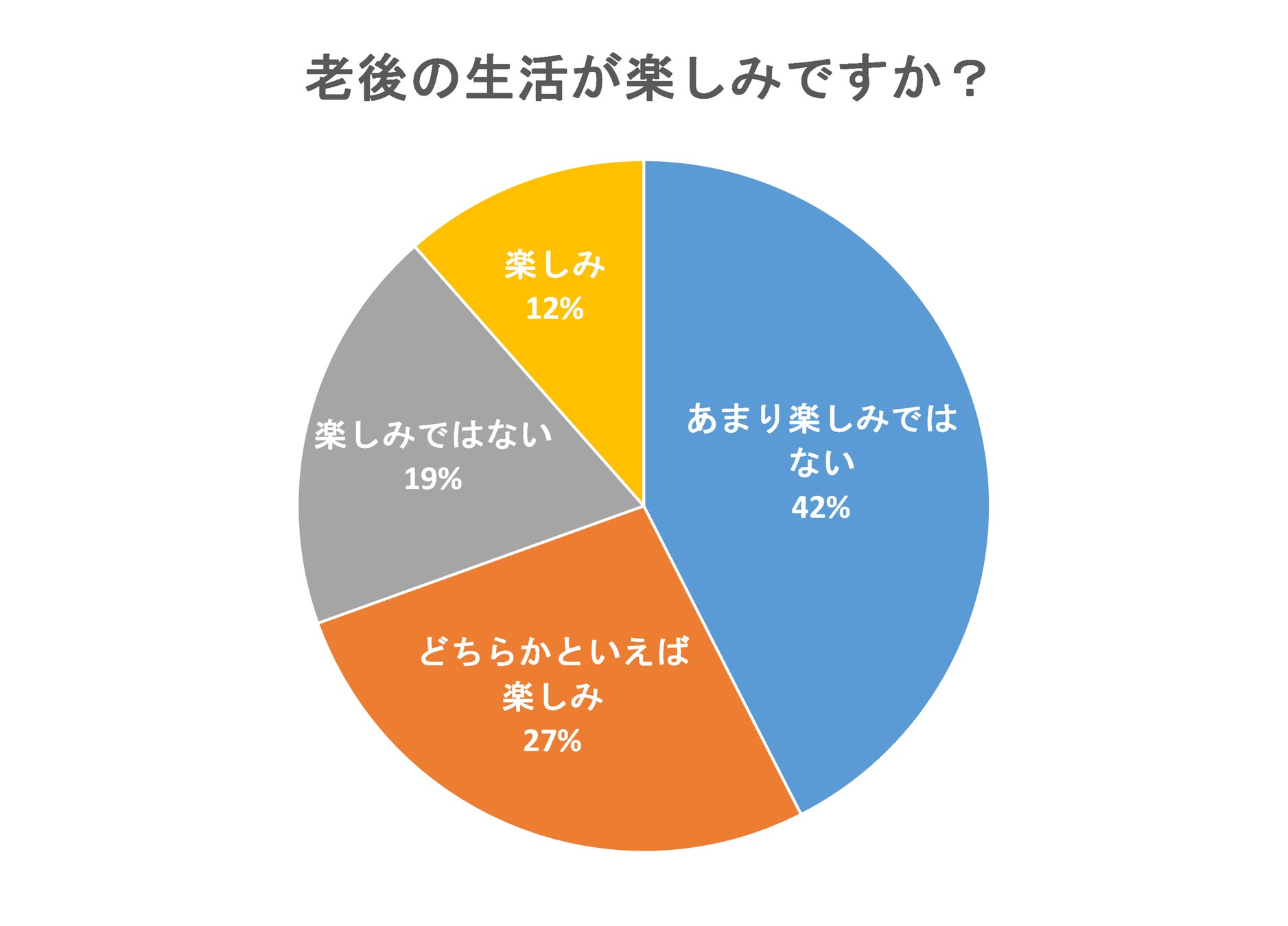 「老後の生活が楽しみですか?」という質問では、42%が「あまり楽しみではない」と回答し、「どちらかといえば楽しみ」が27%、「楽しみではない」が19%、「楽しみ」が12%と続く結果になりました。