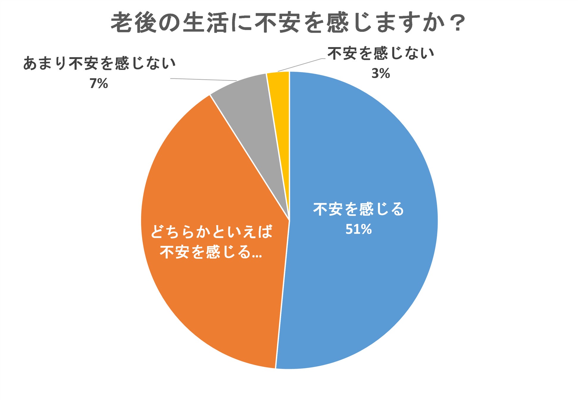 「老後の生活に不安を感じますか?」という質問では、51%が「不安を感じる」、39%が「どちらかといえば不安を感じる」と回答し、全体の90%の人が何らかの不安を感じている結果となりました。