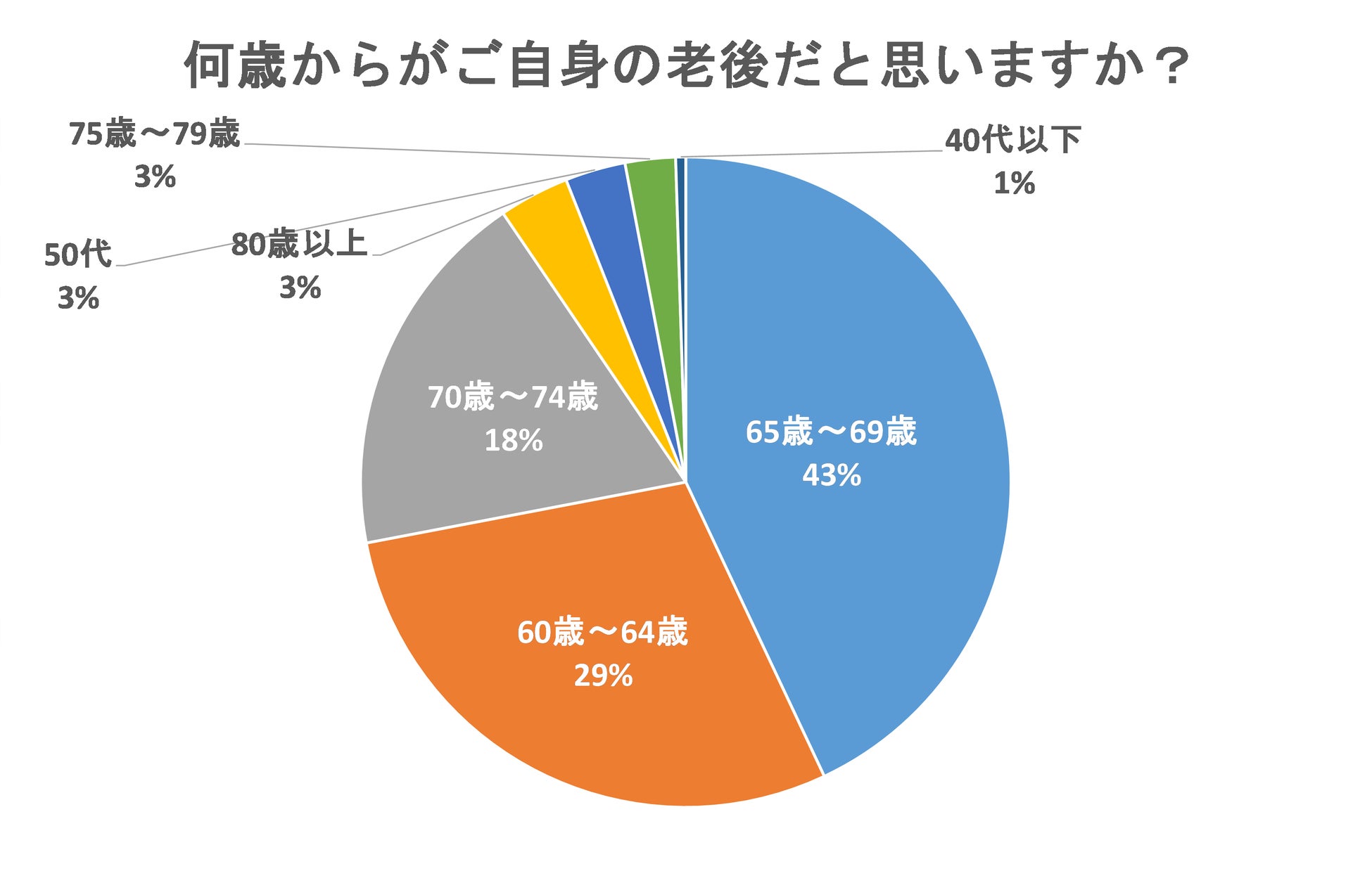 「何歳からがご自身の老後だと思いますか?」という質問では、43%が「65歳~69歳」と回答し、「60歳~64歳」が29%、「70歳~74歳」が18%と続く結果になりました。