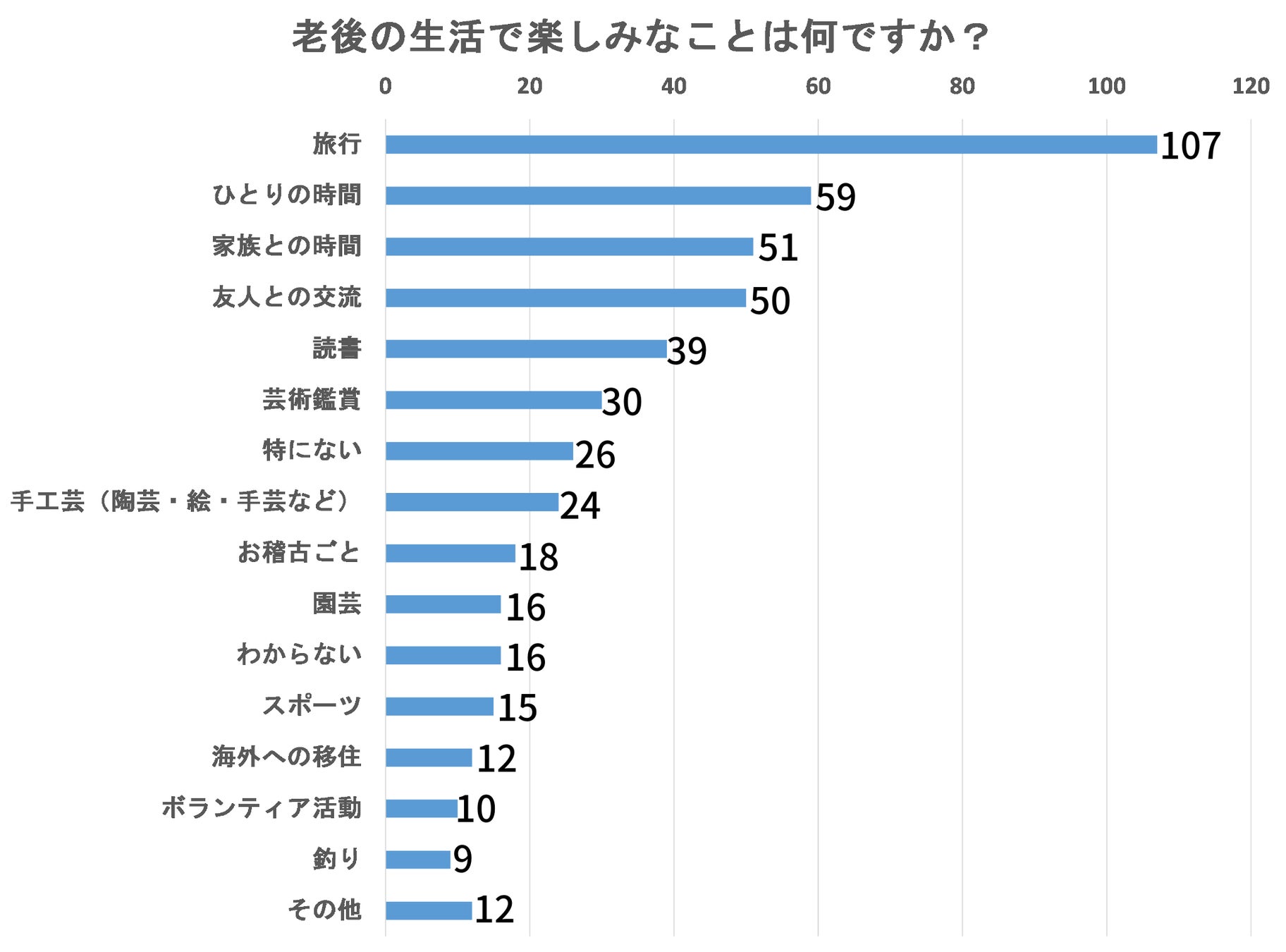 「老後の生活で楽しみなことは何ですか?」という質問では、「旅行」が107票を集め、59票の「ひとりの時間」、51票の「家族との時間」が続く結果になりました。