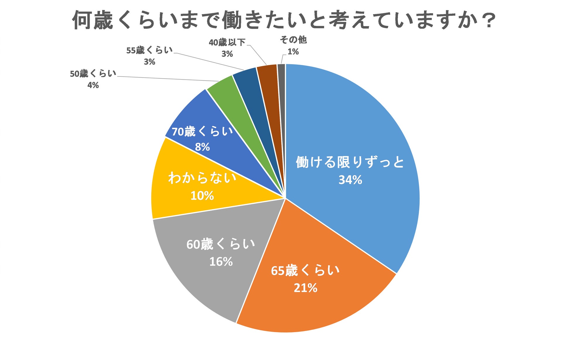 「何歳くらいまで働きたいと考えていますか?」という質問では、34%が「働ける限りずっと」と回答し、「65歳くらい」が21%、「60歳くらい」が16%と続く結果になりました。