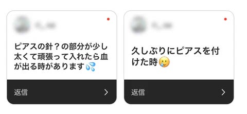 「ポストのサイズが太かったとき」や、「久しぶりにピアスを付けたとき」などに、刺激による出血があったという声が多く見られました。
