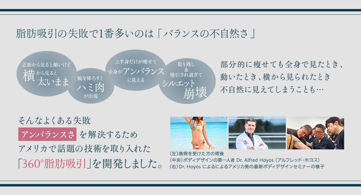 「どの角度から見ても美しい」は、すでにアメリカではスタンダードになりつつあるデザイン思想です。360°脂肪吸引はこの考え方を軸に、ボディデザインの世界的権威であるDr. Alfred Hoyos(アルフレッド・ホヨス氏)から2024年に直接指導を受けた最先端の技術を応用。日本人の骨格や脂肪分布に合わせて独自開発した技術です。バランス/動き/角度をすべて考慮し、日常の動作でも自然でなめらかなボディラインが保たれるよう設計されます。