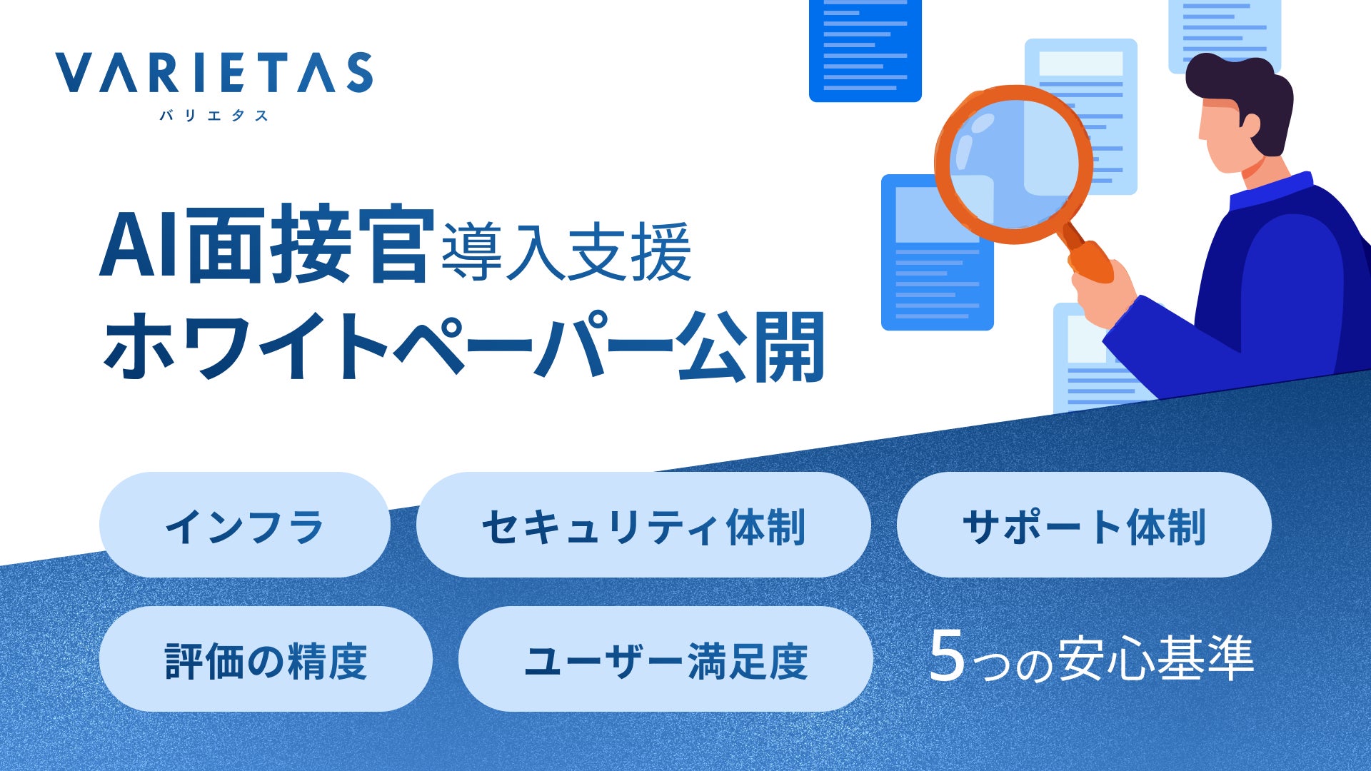 大手企業向け対話型AI面接「AI面接官」を開発・提供する株式会社VARIETAS(読み方:バリエタス、以下「VARIETAS」)は、この度、大手企業における導入・運用実績をもとに、AI面接サービスの選定・運用時に重視される5つの観点(インフラ・セキュリティ体制・評価精度・サポート体制・ユーザー満足度)を体系的に整理した「大手企業向け 導入支援ホワイトペーパー」を策定し、その概要を公開いたしました。