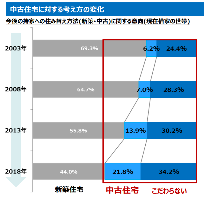 昨今の住宅価格高騰により、比較的手ごろな価格で流通する空き家や中古住宅への需要は、今後益々高まると考えております。実際に消費者の志向も家を買うなら「中古住宅」を選択する層が年々増加傾向にあります*²。しかし手つかずの状態では空き家は流通し難いため、弊社で空き家や中古住宅を買い取り、リフォームを施した良質で廉価な住宅を供給することが、中古住宅流通の活性化の一助になればと考えております。