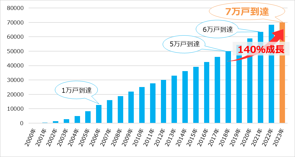 2023年5月をもって、弊社の中古住宅買取再生事業における累計販売戸数が7万戸に到達しました。この事業は1998年に開始し、約8年かけて累計1万戸に到達しました。そして2018年には累計5万戸を達成し、その約28か月後の2021年に累計6万戸に到達しました。そこから約2年という最も短い期間で1万戸の販売件数を積み上げ、2023年5月に累計販売戸数7万戸に到達しました。これにより2018年の5万棟達成から約5年で約140%成長を遂げています。
