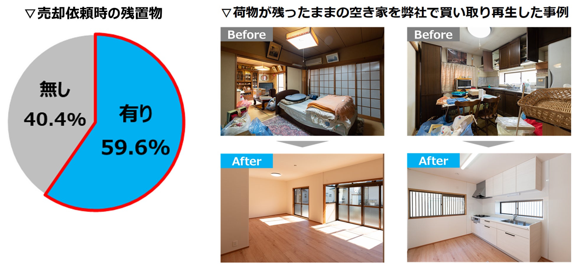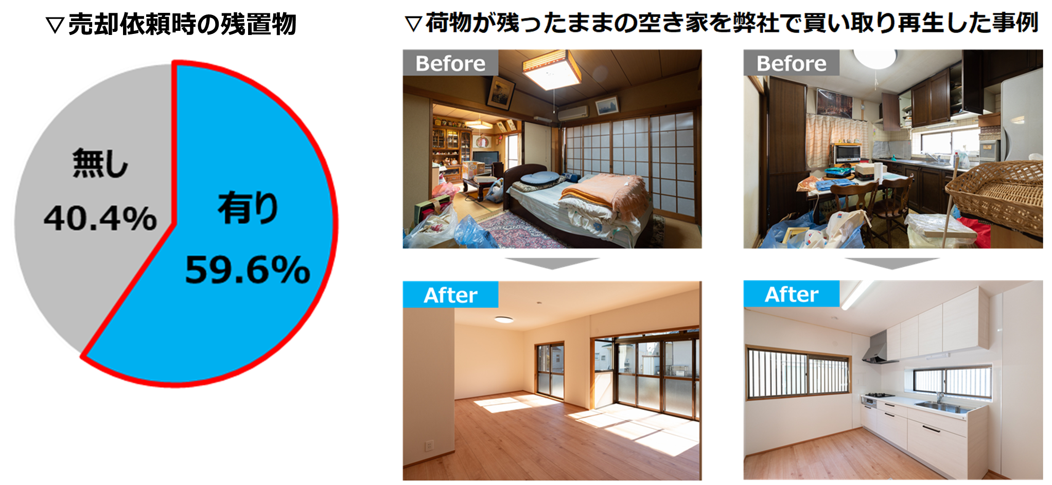 そして「空き家に残された親の荷物が片付かない」とお困りの方は多く存在します。実際に弊社では、「荷物ごと空き家を買い取るサービス」を展開しており、約6割、件数にして2,900件超が、荷物を残したままの状態で売却依頼をいただきました。