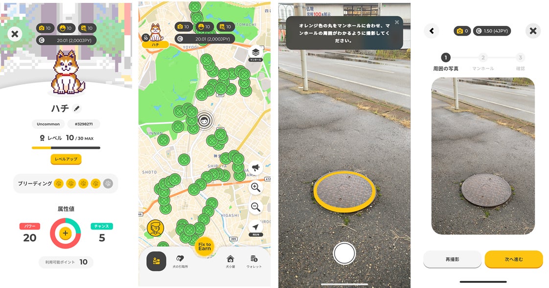 「TEKKON」は、インフラ老朽化の課題に対し、市民が力を合わせて撮影・投稿、レビューし合うことで、インフラの安全を確保することを目的とした新・社会貢献型位置情報ゲームです。マンホールをはじめとする社会インフラの「写真を撮影・投稿する」もしくは「投稿された写真をレビューする」ことで、報酬(インセンティヴ)となるポイントを得ることができるリワード機能を有し、ポイントを使って相棒となる犬のレベルを上げたり犬の数を増やしたりすることで、獲得できるポイントが変わるようゲーム設計されています。