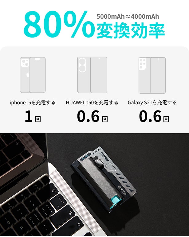 5000mAhの大容量バッテリーを搭載し、エネルギー変換率は約80%。1回の充電でiPhone15などをフル充電でき、充電回数を減らして使用効率を高めることができます。