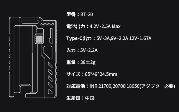 BT-20 は、ほぼすべてのリチウムイオン(フラットトップ) 21700、20700 バッテリーに対応。 さらに、アダプターを使用して、小型の18650 バッテリーも対応可能。