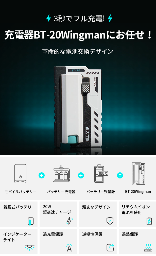 【新商品】革命的なバッテリー交換デザイン、3秒でフル充電!様々なデバイスに対応する充電器「BT-20Wingman」