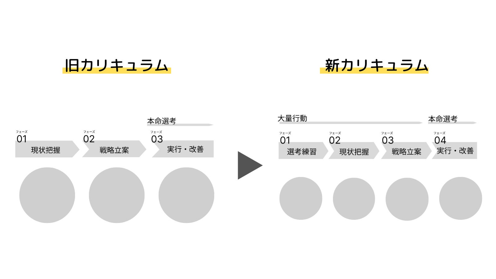 これまでは、自己分析からスタートして自分自身に矢印を向けることで『自身の強み』に気づき企業研究から転職活動を始めるカリキュラム構成でした。今回のアップデート4.0版は、自己PRの書き方から面接対策に至るまで基本的な転職教育と並行して、まずは1ヶ月間の転職活動に伴走。「行動を変え、思考を変え、結果を変えていく」を体現し、コーチとの振り返りにより自己理解を深め、転職成功のロジックがより細分化された内容となっております。