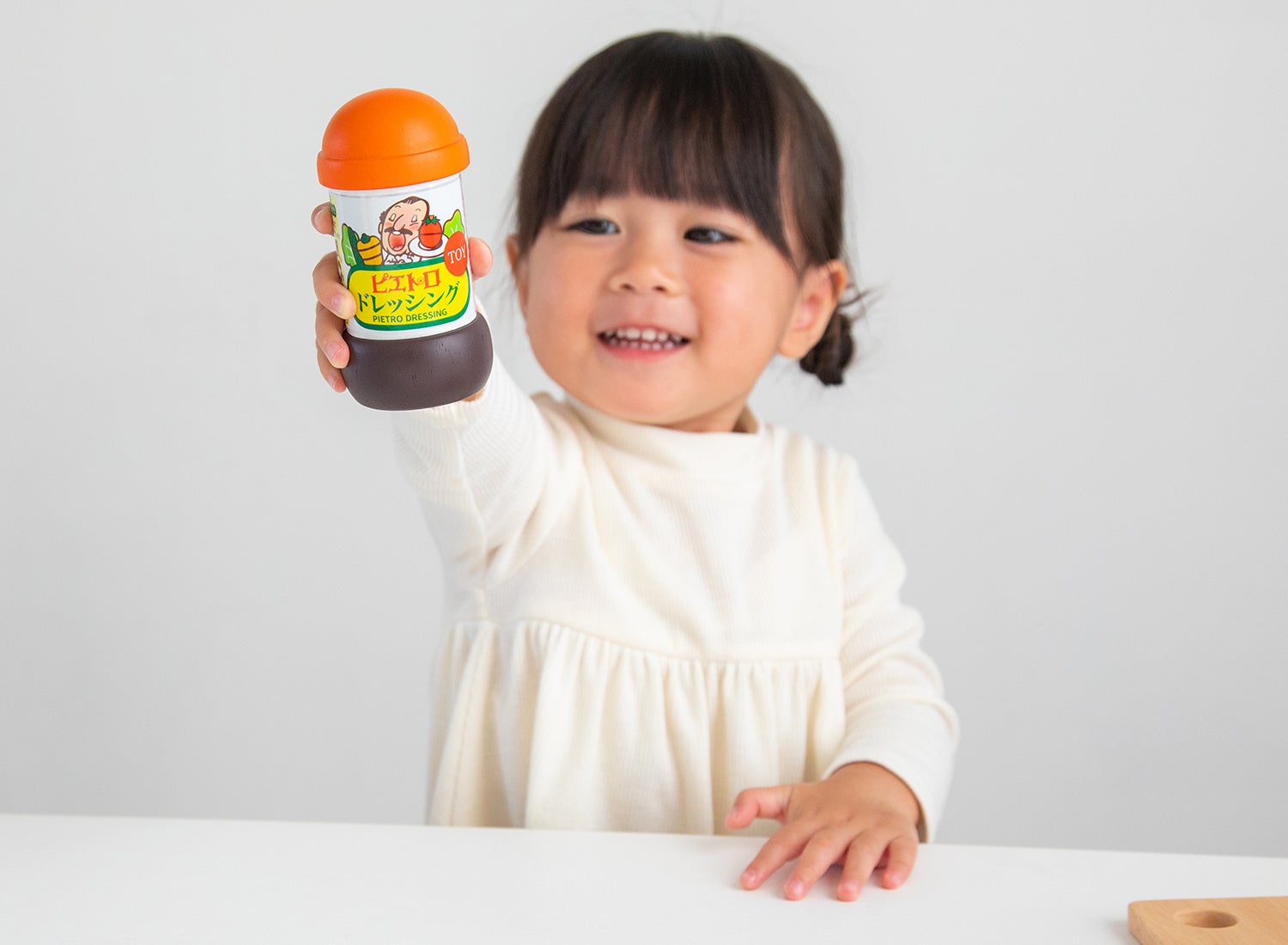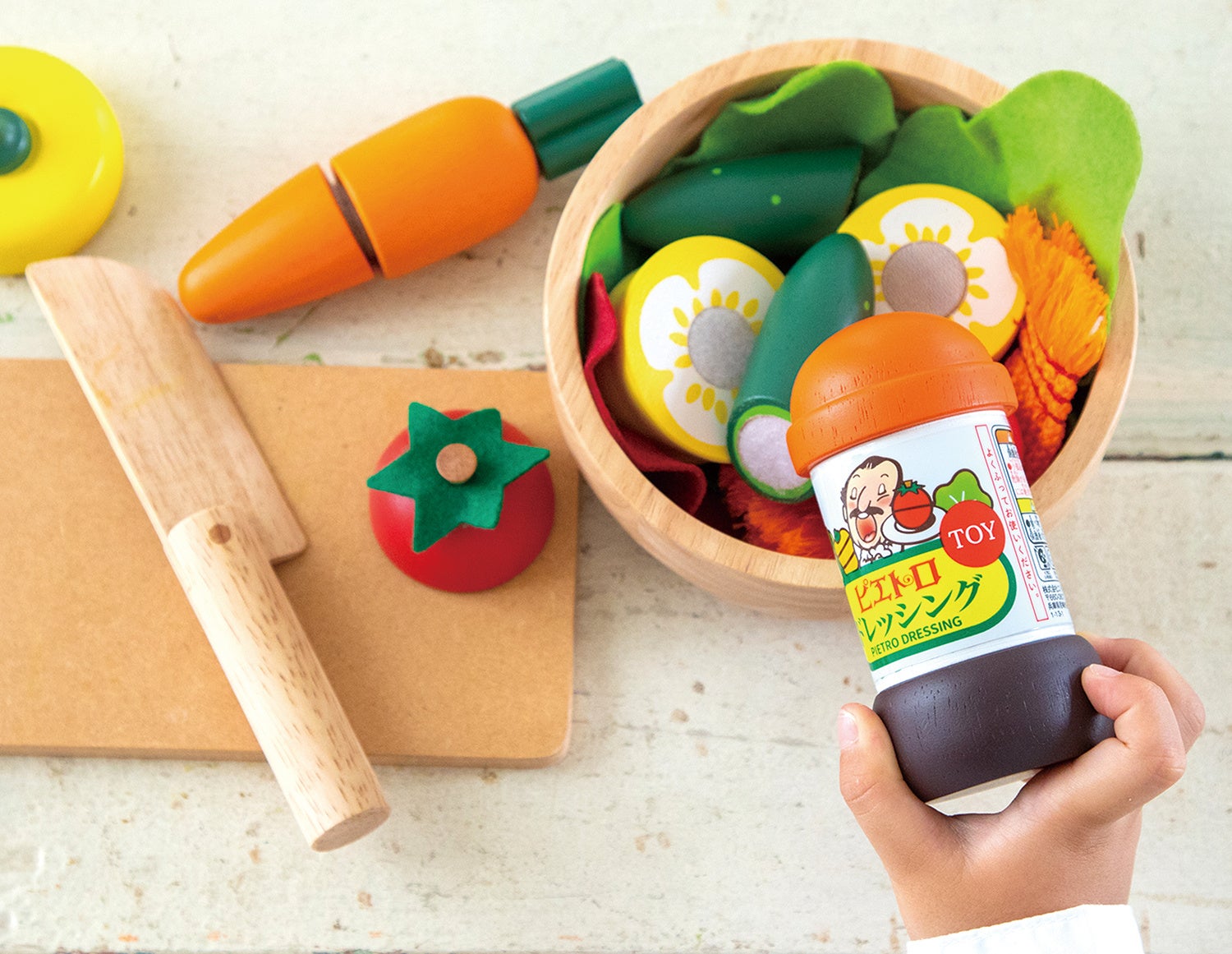 野菜嫌いがなおる魔法のドレッシングとして、サラダをおいしく召し上がっていただくことはもちろん、万能調味料としてさまざまな料理に活躍する「ピエトロドレッシング」。定番ドレッシングとして創業当時から愛されている「ピエトロドレッシング 和風しょうゆ」をモデルにしたドレッシングと、サラダにぴったりのカラフルな野菜と、サラダならではの調理器具をセットにした木のままごとです。