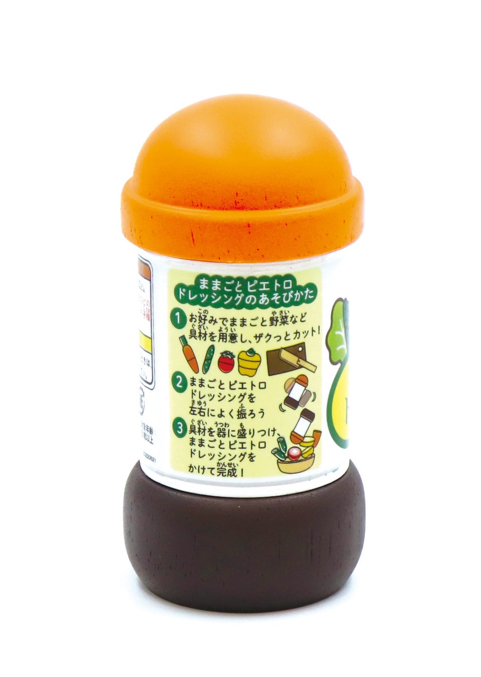 お子様の手になじみやすいコロンとしたサイズの木製ドレッシングは「ピエトロドレッシング 和風しょうゆ」のオレンジ色の丸いキャップを再現し、ピエトロドレッシングのフィルムを巻いてリアルさを追求。本物そっくり!と思いきや、ピエトロおじさんがおもちゃの野菜に囲まれているという、遊び心いっぱいのオリジナルデザインになっています。
