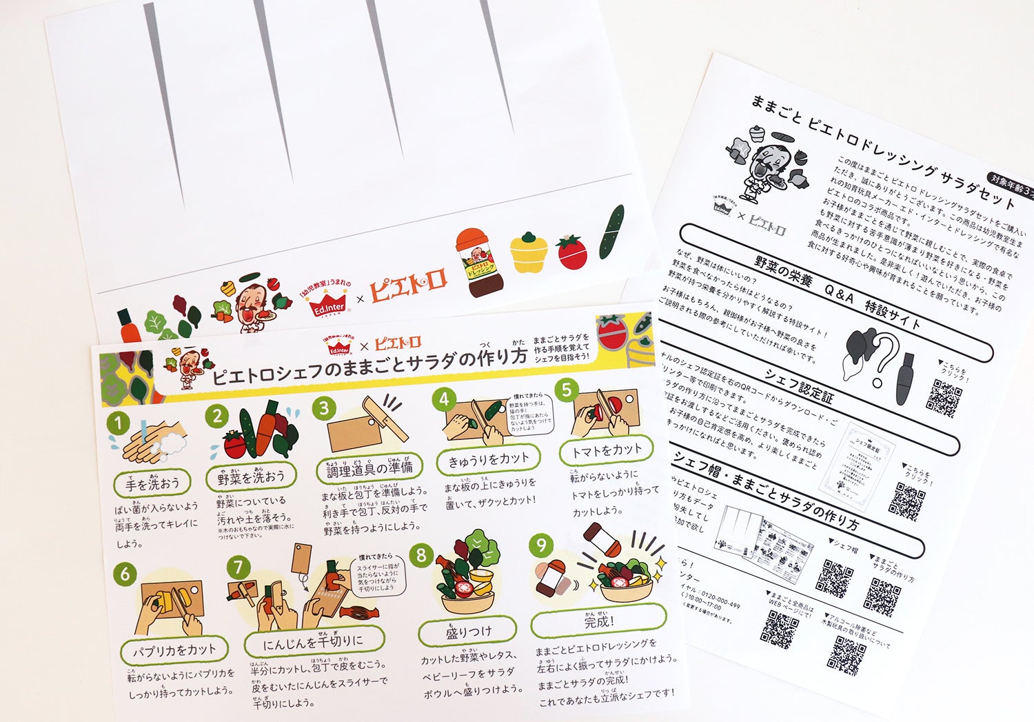ピエトロシェフ監修のままごとサラダの作り方シートには「手を洗おう」「野菜を洗おう」など、実際の工程や調理器具の扱い方のアドバイスを、お子様にも分かりやすいイラストでご紹介。お子様向けの野菜Q&A特設サイトや、ダウンロード形式のシェフ認定証などの食育につながるコンテンツもご用意しています。認定証でお子様の頑張りを褒めてあげることで自己肯定感とやる気を高めます。