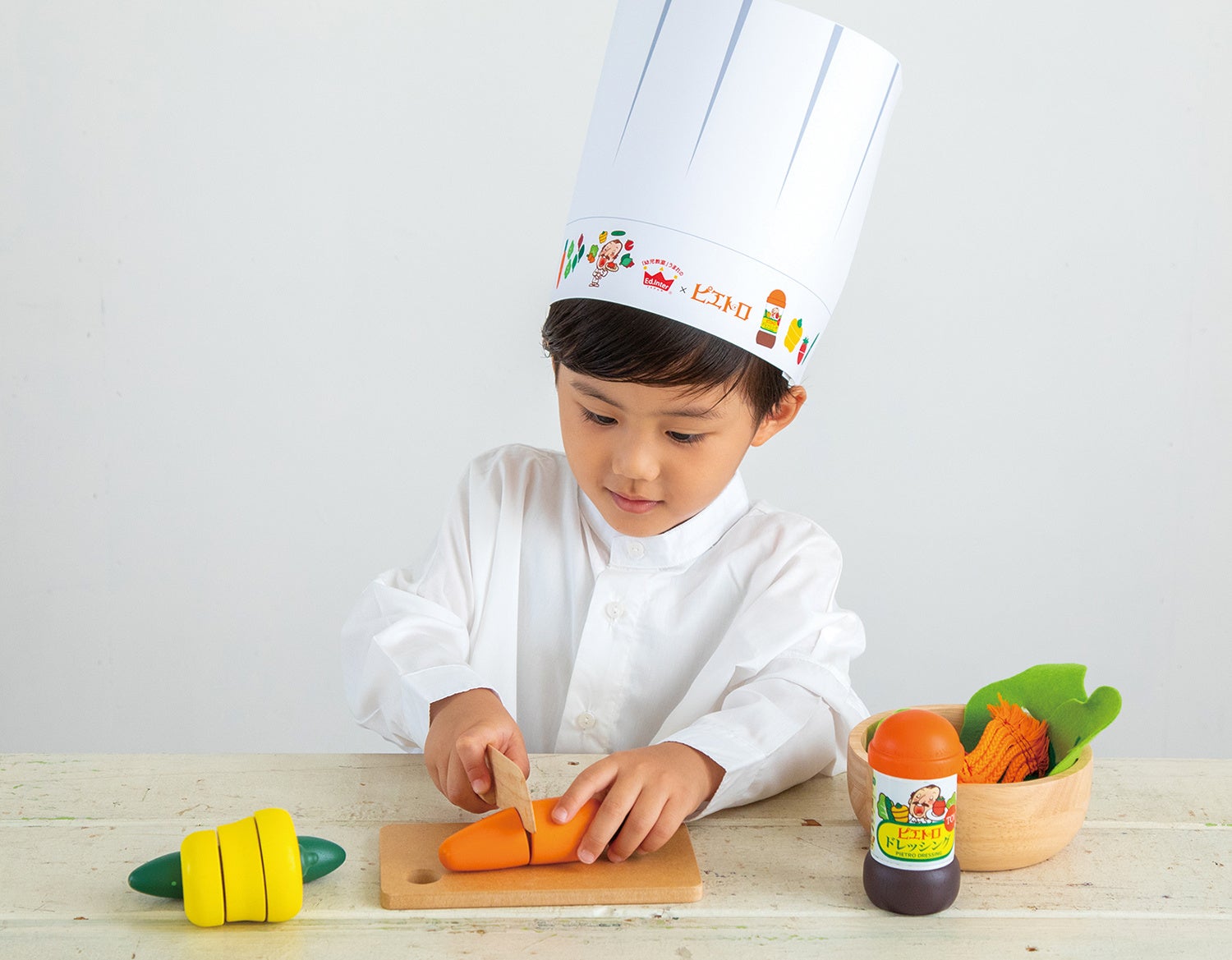 セットには食材に加えて、大きなサラダボウルやまな板・スライサー、包丁などの調理道具がセットになっており、すぐに遊び始めることができます。ピエトロロゴ入りのオリジナルペーパーシェフ帽付きで、お子様の気分も大盛り上がり!シェフになりきってままごとあそびを楽しめます。