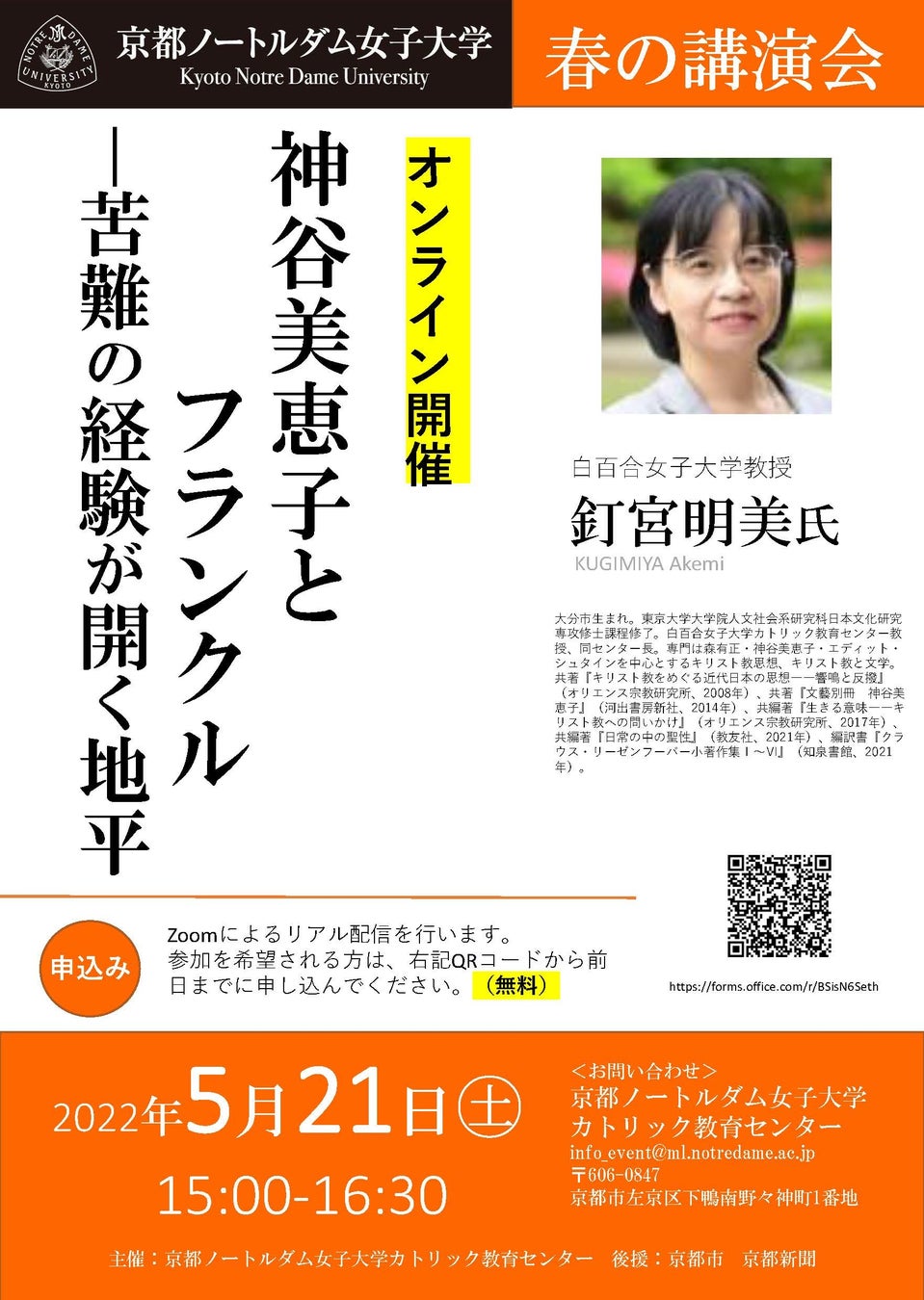 京都ノートルダム女子大学(学長:中村久美、所在地:京都府京都市左京区)は、2022年5月21日(土)カトリック教育センター主催「春の講演会」(オンライン/無料)を開催します。