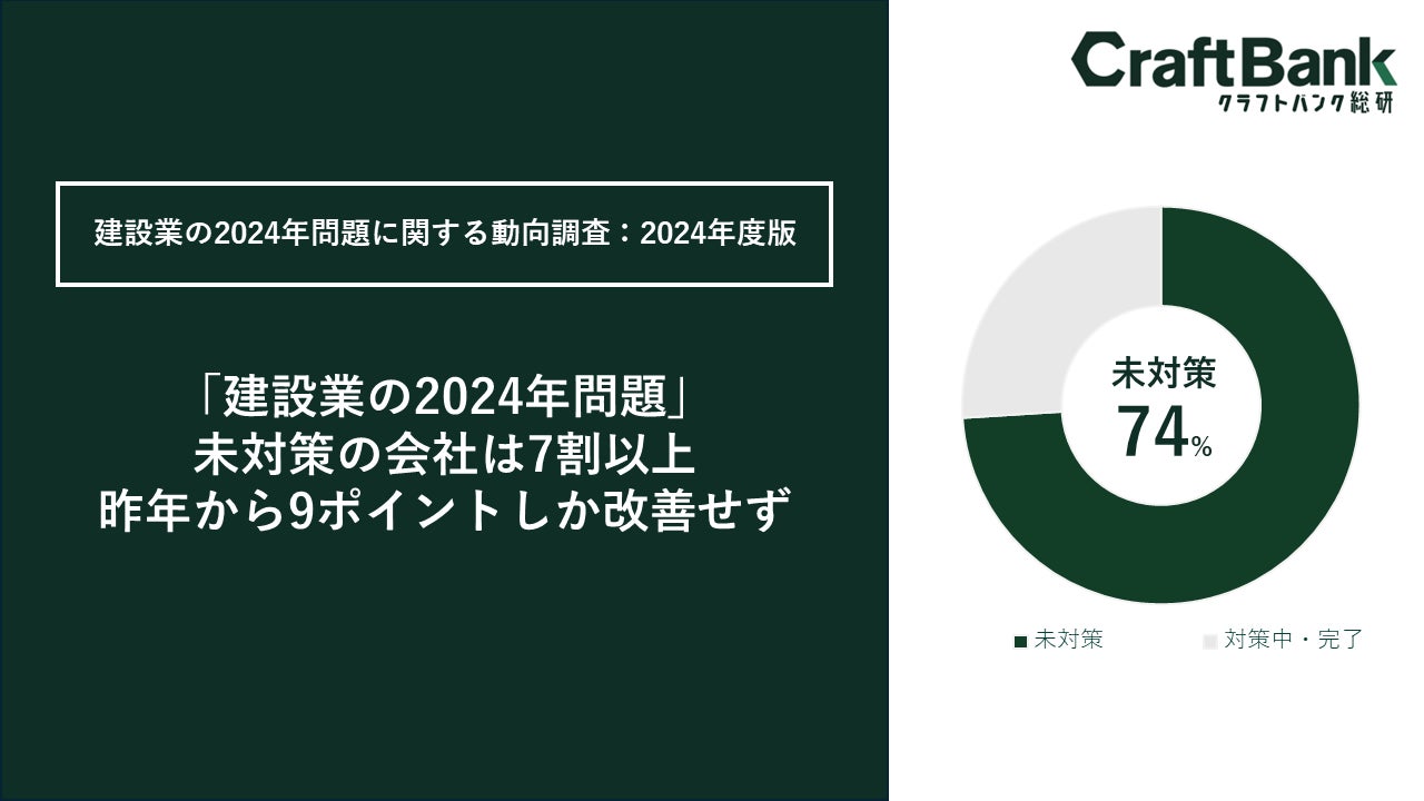 「建設業の2024年問題」7割以上の工事会社が未対策、昨年から9ポイントのみ改善。いまだ多くの工事会社で対策が講じられていない実態が判明