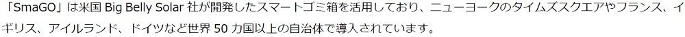 事業内容:日本各地へのスマートゴミ箱「SmaGO(スマゴ)」の設置を通した、街と企業と人々が一体となった環境活動の提案