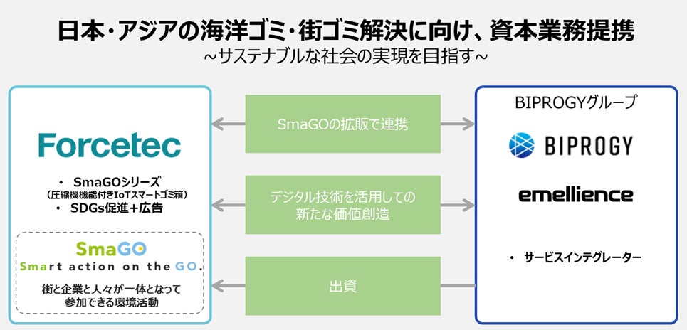 本業務提携を通じて、BIPROGYグループのデジタル技術とフォーステックの「SmaGO」を活用し、両社の強みを生かして、「街の美観維持(街や観光地のゴミ問題・景観破壊問題の解消)」「都市環境の良好化(誰もが心地よく暮らせる社会の実現)」「ゴミ回収の効率化(人材不足解消、自治体などのコスト負担軽減)」「ゴミ回収車の運行頻度低減による温室効果ガス削減」など、持続可能な循環型社会の実現に取り組んでいきます。