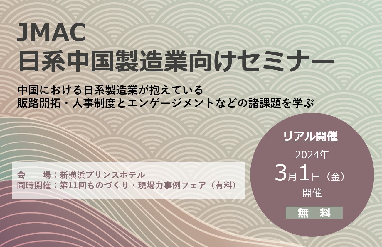 株式会社日本能率協会コンサルティング(本社:東京都港区・代表取締役社長:小澤勇夫、以下JMAC)は、2024年3月1日(金)、中国における日系製造業が抱えている販路開拓・人事制度とエンゲージメントなどの諸課題を学ぶ『日系中国製造業向けセミナー』を開催します。