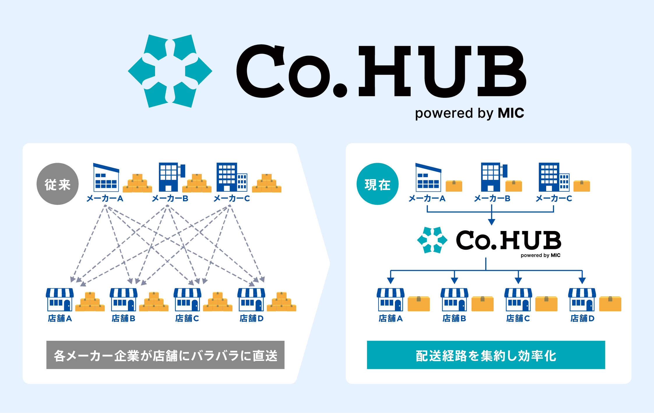 小売店とメーカーを対象とした販促物の共同配送サービス「Co.HUB」は、店舗負担の軽減、物流効率化やCO₂削減、販促物の使用率向上を実現し、リリースから2年半でドラッグストアの約半数に導入されています