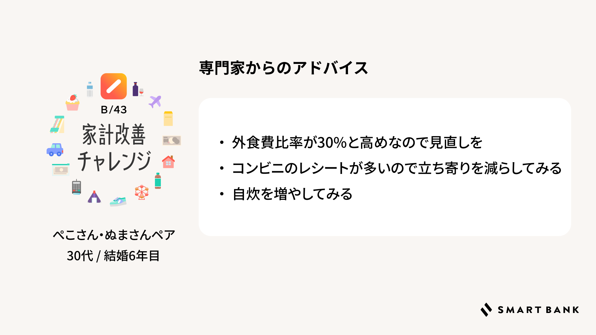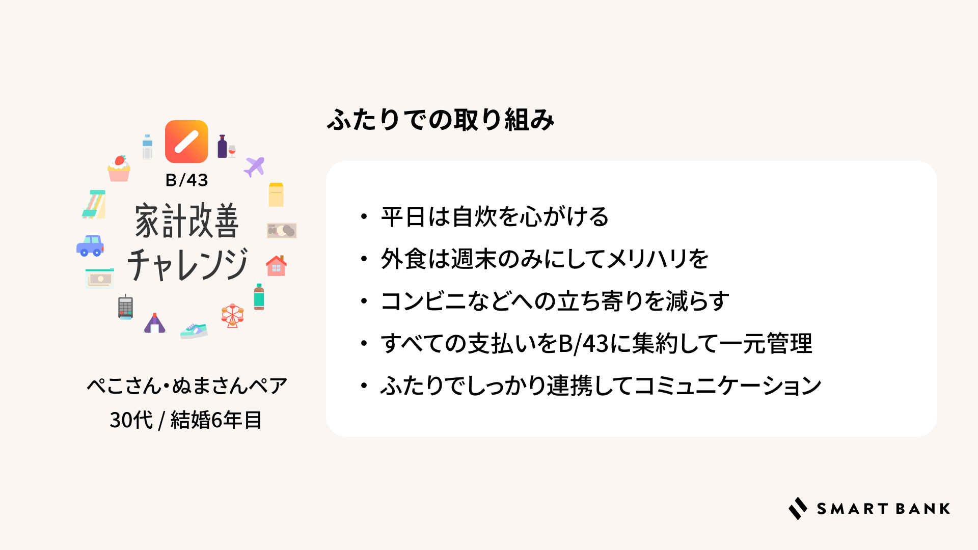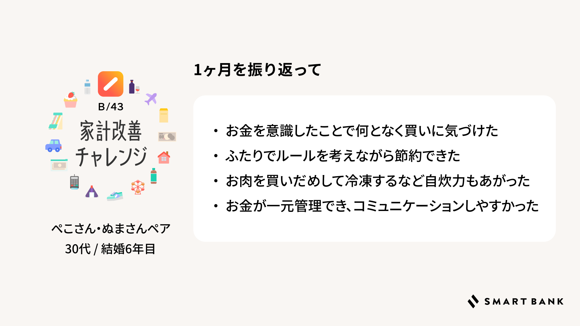 「ぺこさん&ぬまさんペアは、私からのアドバイス以上にしっかりとふたりで考えて気付き、そして改善しながら取り組んでいただけました。節約は生活の負担になると考えられがちですが、おふたりはB/43も使いながら円満に改善されていることが素晴らしいと思います。