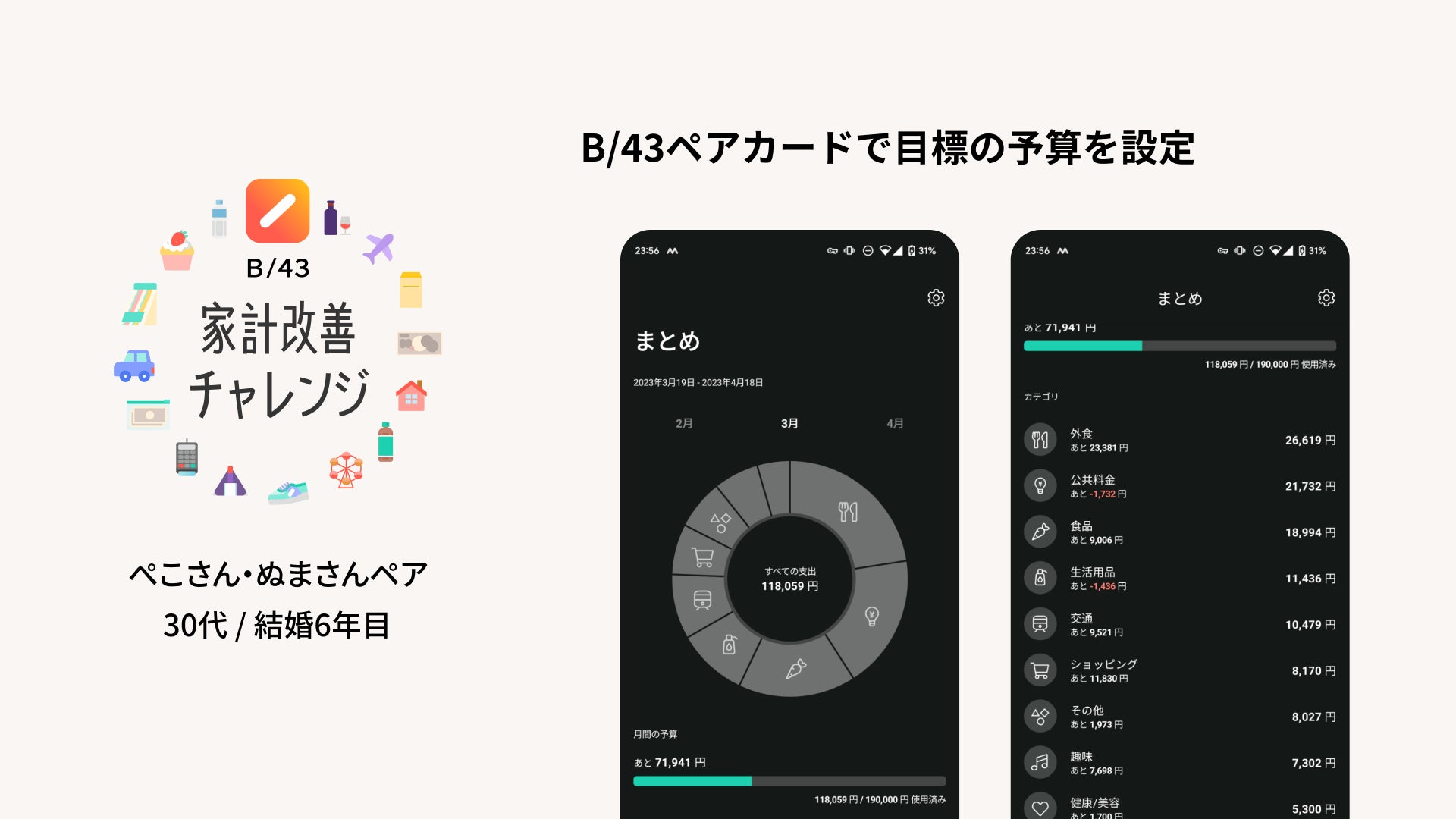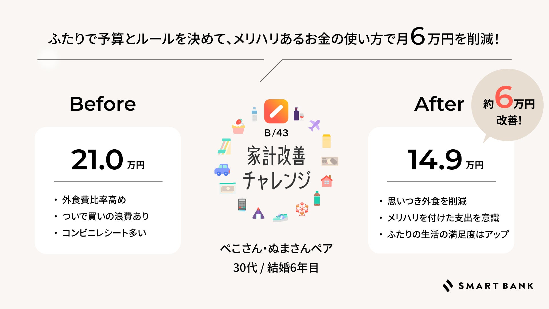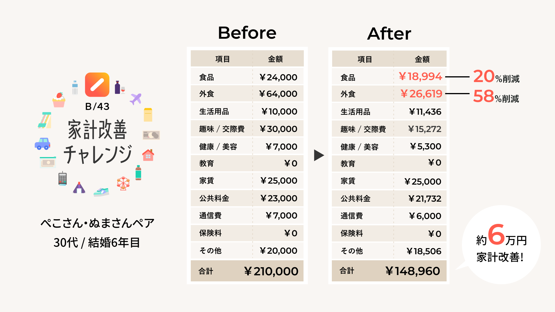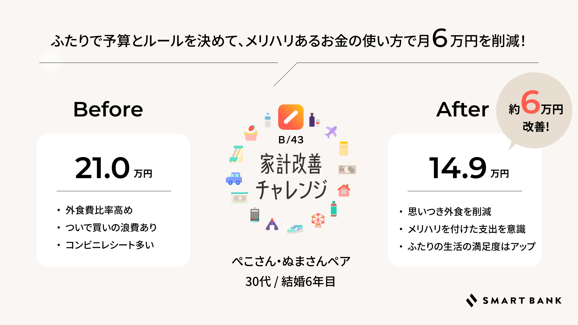 第一弾は、結婚6年目の夫婦のふたりがB/43ペアカードを使って1ヶ月間の家計改善にチャレンジしたところ、月6万円の節約に成功いたしました。
