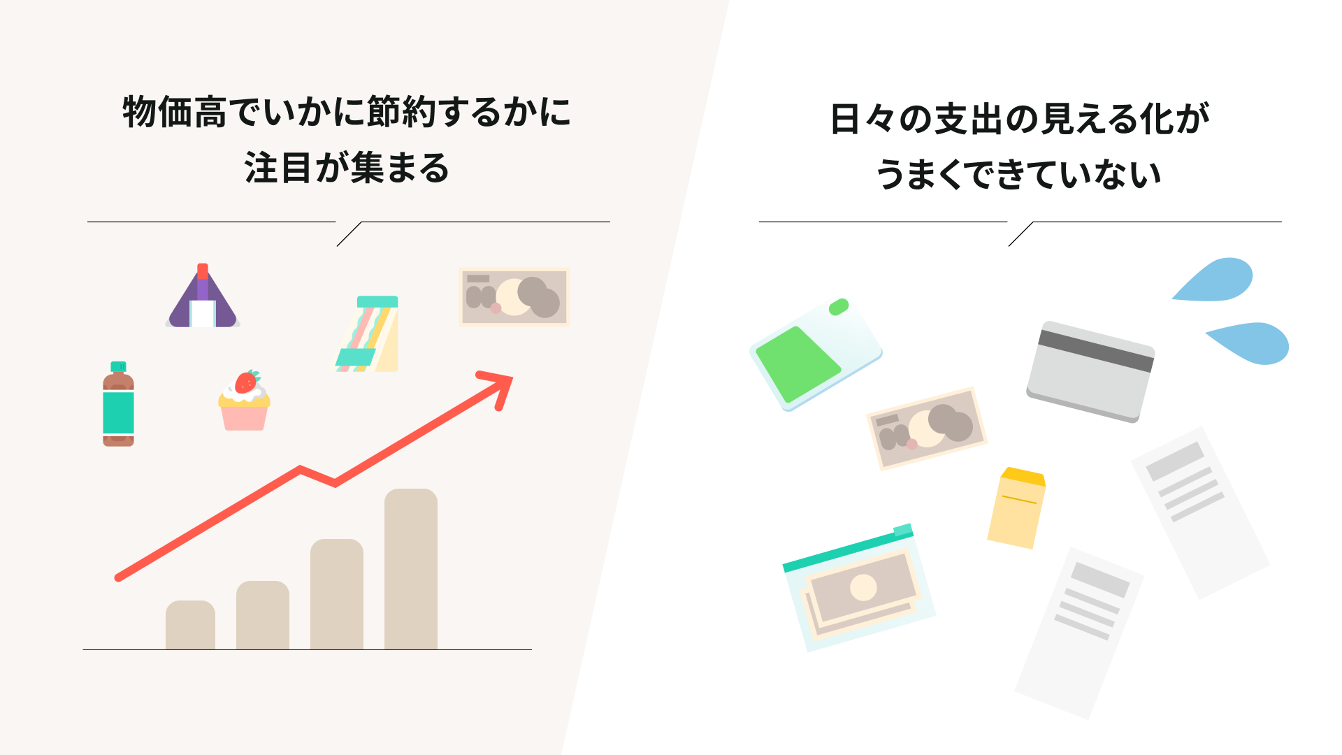 昨年からの物価高が続く中で、いかに家計を節約するかに関心が集まっています。一方で、夫婦やカップルは、それぞれの現金やカードで支払いをすることも多く、家計改善の第一歩である日々の支出の見える化がうまくできていないことが課題になっています。