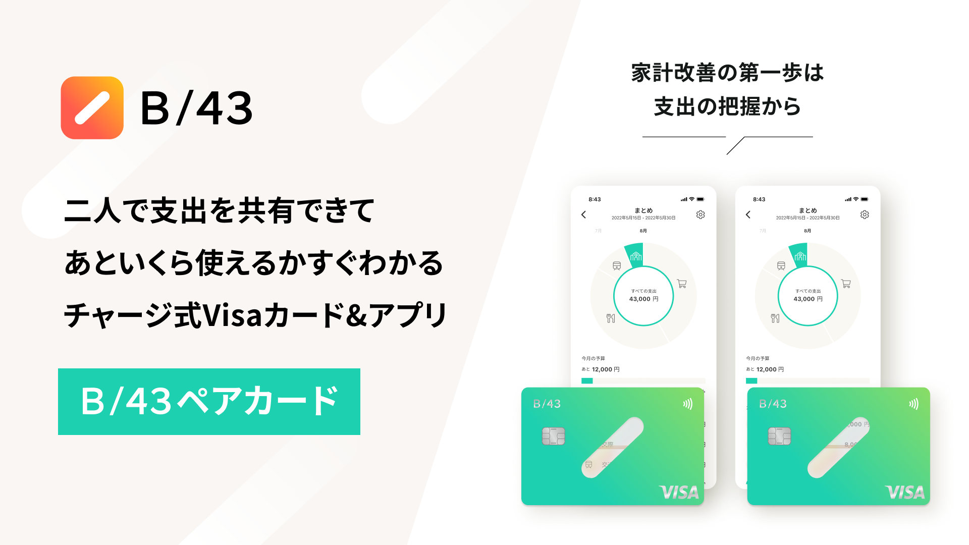 「B/43」とは、Visaプリペイドカードと家計簿アプリがセットになった新しい支出管理サービスです。毎月の予算をプリペイドカードにチャージして支払いを行うだけで、アプリに支出の明細がリアルタイムで反映されるため、簡単に支出管理が可能です。夫婦や同棲カップルで使える「B/43ペアカード」では、一つの口座で二つのカードが作れて面倒な割り勘や現金のやり取りが不要になり、ふたりで一緒に支出を確認できます。また、親子向けの「B/43ジュニアカード」ではキャッシュレスでお小遣いを渡し、親子で一緒にお金の管理ができます。(参照URL:https://b43.jp/)