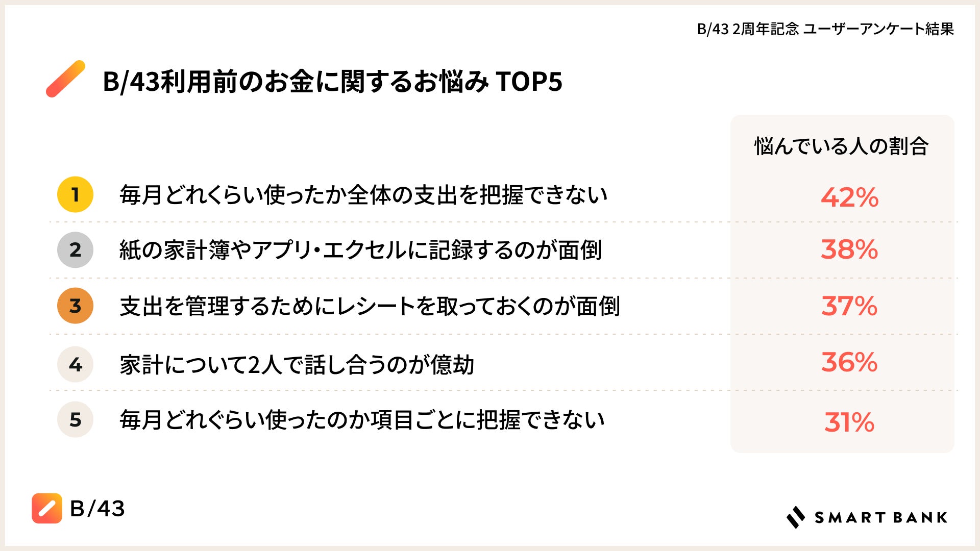 実際に、2023年3月にB/43ユーザー100人にアンケートを取ったところ、「毎月どれくらい使ったか全体の支出を把握できない」(42%)、「家計について2人で話し合うのが億劫」(36%)という声がありました。