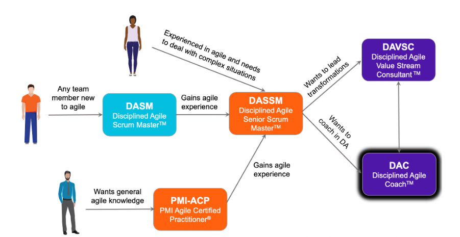 PMIアジャイル認証プログラムでは、基礎から、それぞれの専門性やリーダー特性に適合するための認定要件と資格体系が設定されています。今回、アクシスインターナショナルで提供する公開型の認定資格研修は、「ディシプリンドアジャイル・コーチ(DAC)」です。