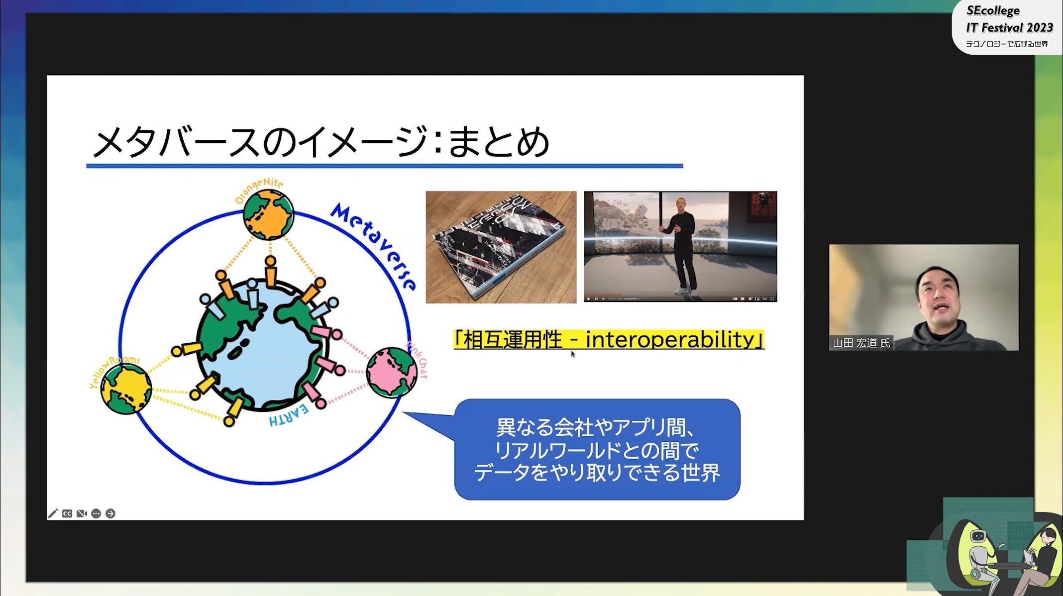 まずは、メタバースの説明をしていただきました。メタバースの語源は「meta- (超越する、高次元の)」と「universe(宇宙)」であり、異なる会社やアプリ間、リアルワールドとの間でデータをやり取りできる世界のイメージであるそうです。