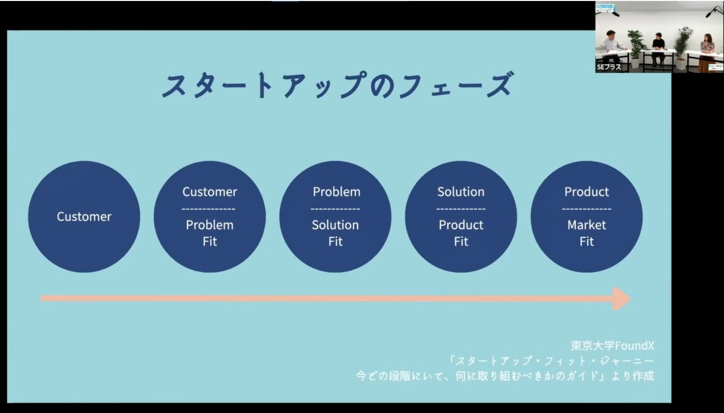 まずは、新規プロダクト開発の定石について伺いました。フレームワークのように知られている「スタートアップ・フィット・ジャーニー」というものがあり、このフェーズを意識して、チームがいまどこにいるか、共通認識を合わせることが大切だそうです。また、新規プロダクト開発を始める際、誰が、どんな課題を抱えていて、お金を払っても解決したいと思うものを探し当てることも非常に重要だそうです。
