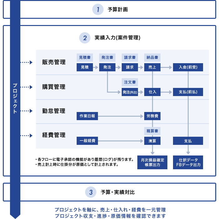 システムの一元化により、データの重複入力などのムダを省き、業務の効率化を実現します。管理部門の人的コストを劇的に削減し、月次決算の早期化も実現します。