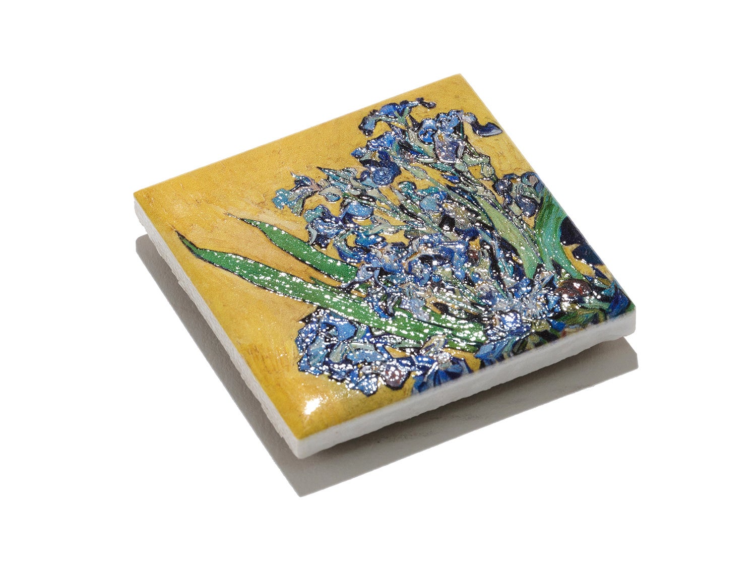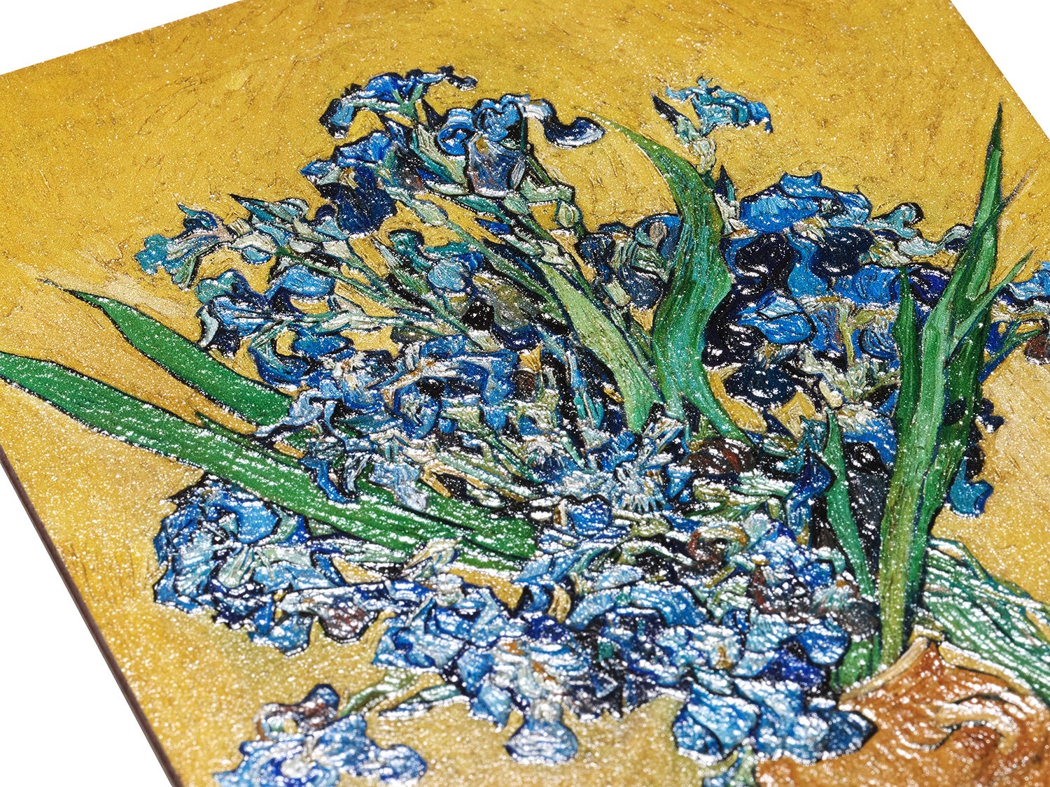 ゴッホの静物画の代表作の一つである「アイリス」は、日本の浮世絵から強い影響を受けたと言われており、輪郭がくっきりと描かれているのが特徴です。うねるように描かれた小さな青い時花びらたちと、直線的な緑の葉に異なるテクスチャーを施すことで、原画の持つ圧倒的な存在感を再現しました。じっと見つめていると、今にも吸い込まれそうな不思議な感覚に包まれます。
