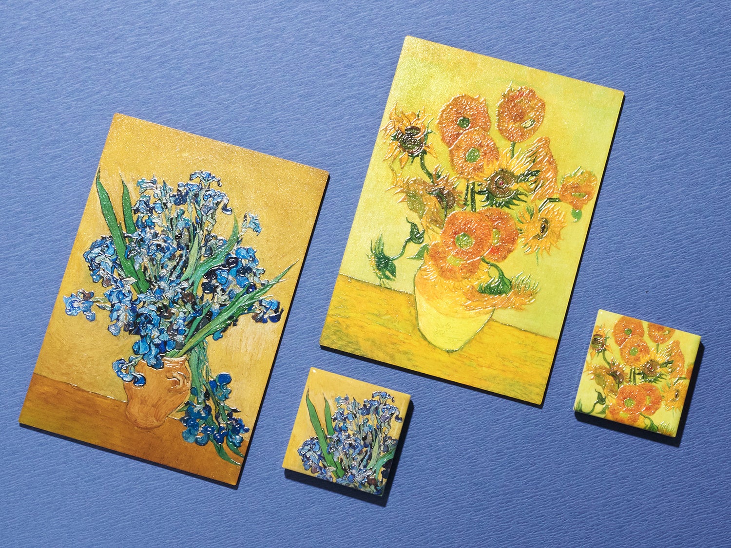 フィンセント・ファン・ゴッホの代表作「ひまわり」と「アイリス」をモチーフにした「PENON タッチミー!ウッドポストカード」と「PENON タッチミー!アートマグネット」