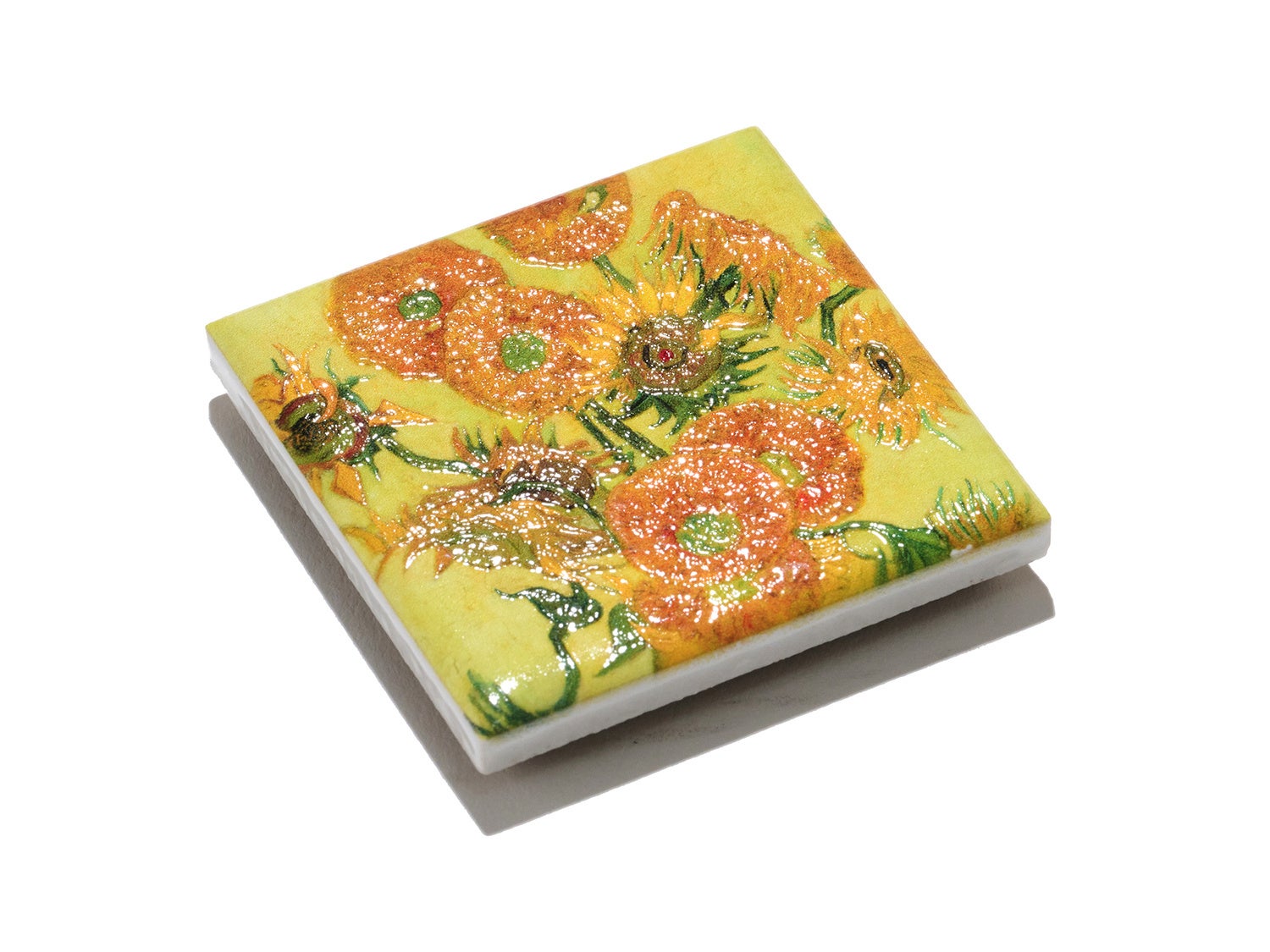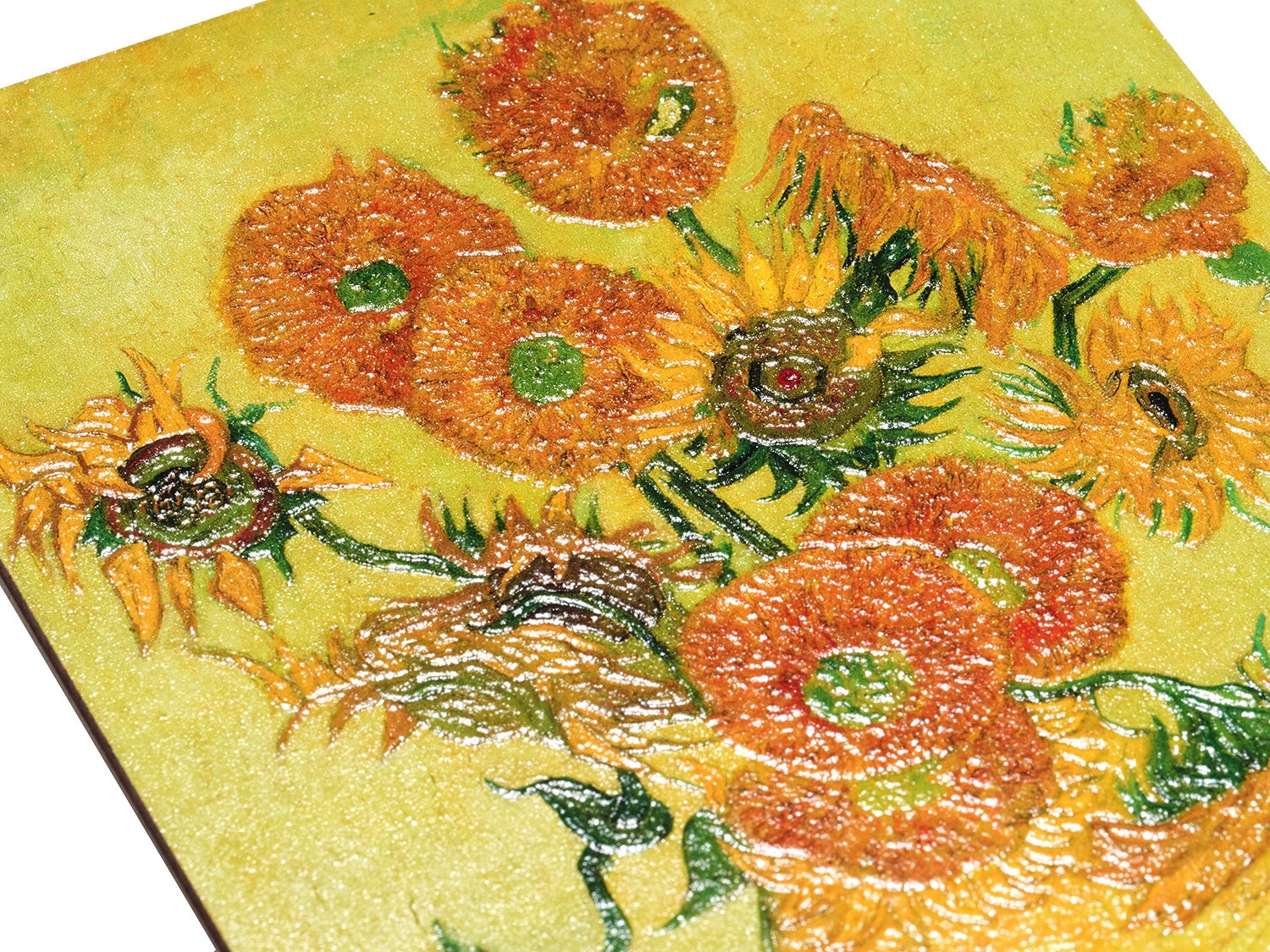 言わずと知れたゴッホの名作「ひまわり」の最大の特徴である、鮮やかな色彩表現と大胆で力強いタッチをオリジナル作品に忠実に再現しました。ひまわりの花びら1枚1枚に至るまで、全体に細やかな凹凸をつけることで立体感を際立たせています。花瓶やテーブルの少しざらりとした質感にもご注目ください。目を閉じて指先で触れると、原画に直接触れているような感覚を体験できます。