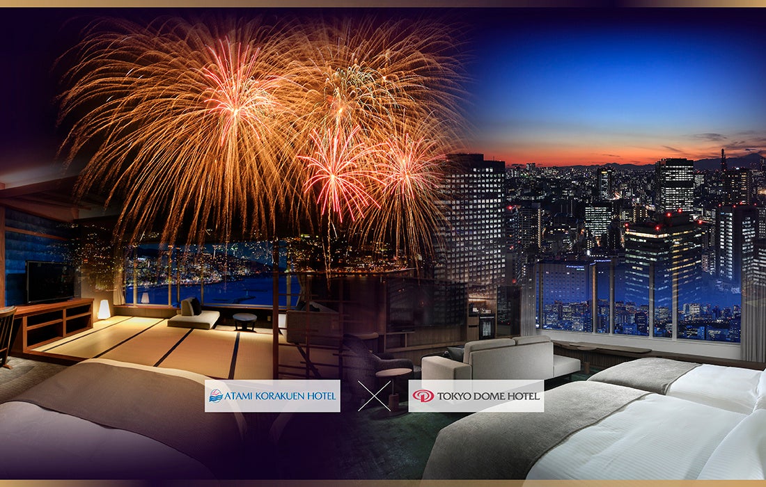 25周年の東京ドームホテルと60周年の熱海後楽園ホテルが「最上級のおもてなし」でコラボレーション。高層階から眺める都心の絶景から海を見渡す花火鑑賞まで、都会とリゾートを一度に満喫する最上級の旅をご提案
