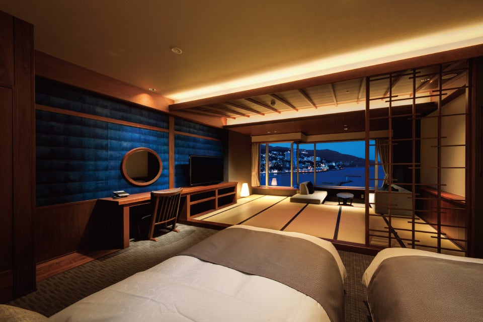 相模灘・熱海市街が一望できる客室からは、熱海海上花火大会の大迫力の花火を間近でお楽しみいただけます。プライベート空間で目の前に広がる花火を見渡す贅沢なひと時を。