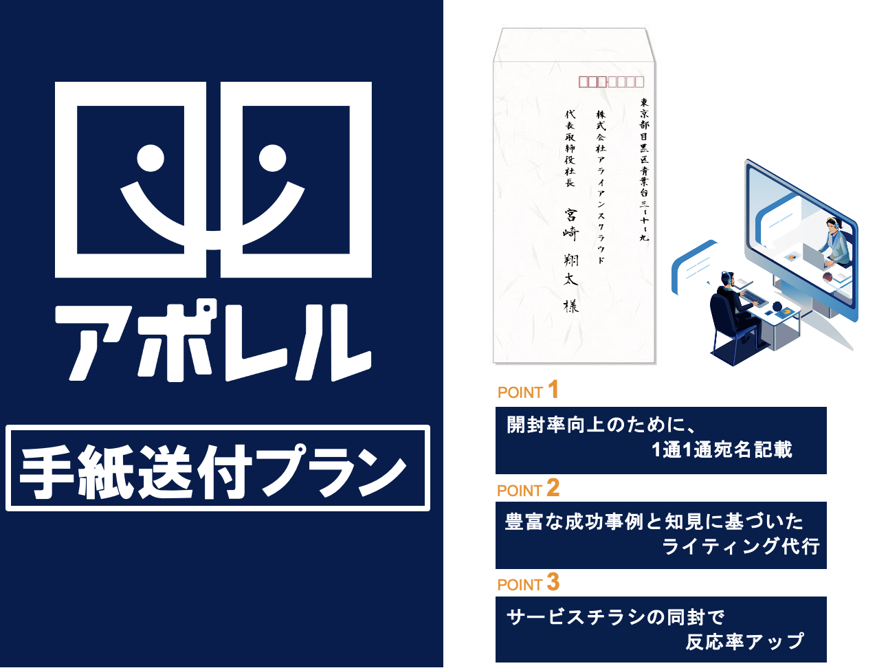 決裁者とのアポイント獲得支援SaaS「アポレル」を運営する株式会社アライアンスクラウド(本社:東京都目黒区、代表取締役:宮崎 翔太 以下「当社」)は、ユーザーの営業活動支援を目的とした「アポレル手紙送付プラン」をリリースしたことをお知らせします。これにより、通常のマーケティングでは獲得できなかったターゲット企業へ手紙を送ることで確度の高い商談獲得を実現し、新規開拓のサポートをいたします。