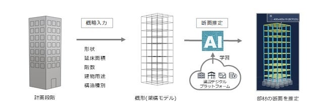 構造設計結果を学習したAIが、柱・梁などの配置条件や構造的特徴から必要断面寸法を推定します。設計初期段階のお客様の速やかなプラン検討を支援します。