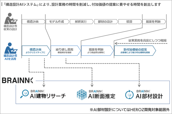今回共同開発した『構造設計AIシステム』は、AI建物リサーチ・AI断面推定・AI部材設計の3つで構成されており、HEROZはAI建物リサーチ・AI断面推定部分を担当しています。集約された構造部材の諸情報をこのシステムで学習し、設計業務の中の設計ツールを用いる時間を大幅に削減します。お客様への設計提案を迅速に行うことができ、これまで以上に速やかにプラン提案が可能となります。そして新たな付加価値の提案に費やせる時間が増えることで、より高品質な建物設計を実現に寄与いたします。