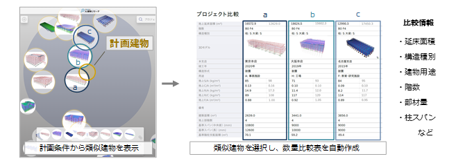 プロジェクト初期段階での構造計画提案を支援します。計画条件ごとに複数の類似建物が提示されるため、構造計画別の部材数量を容易に比較でき、合理的な構造計画の方針決定が可能となります。